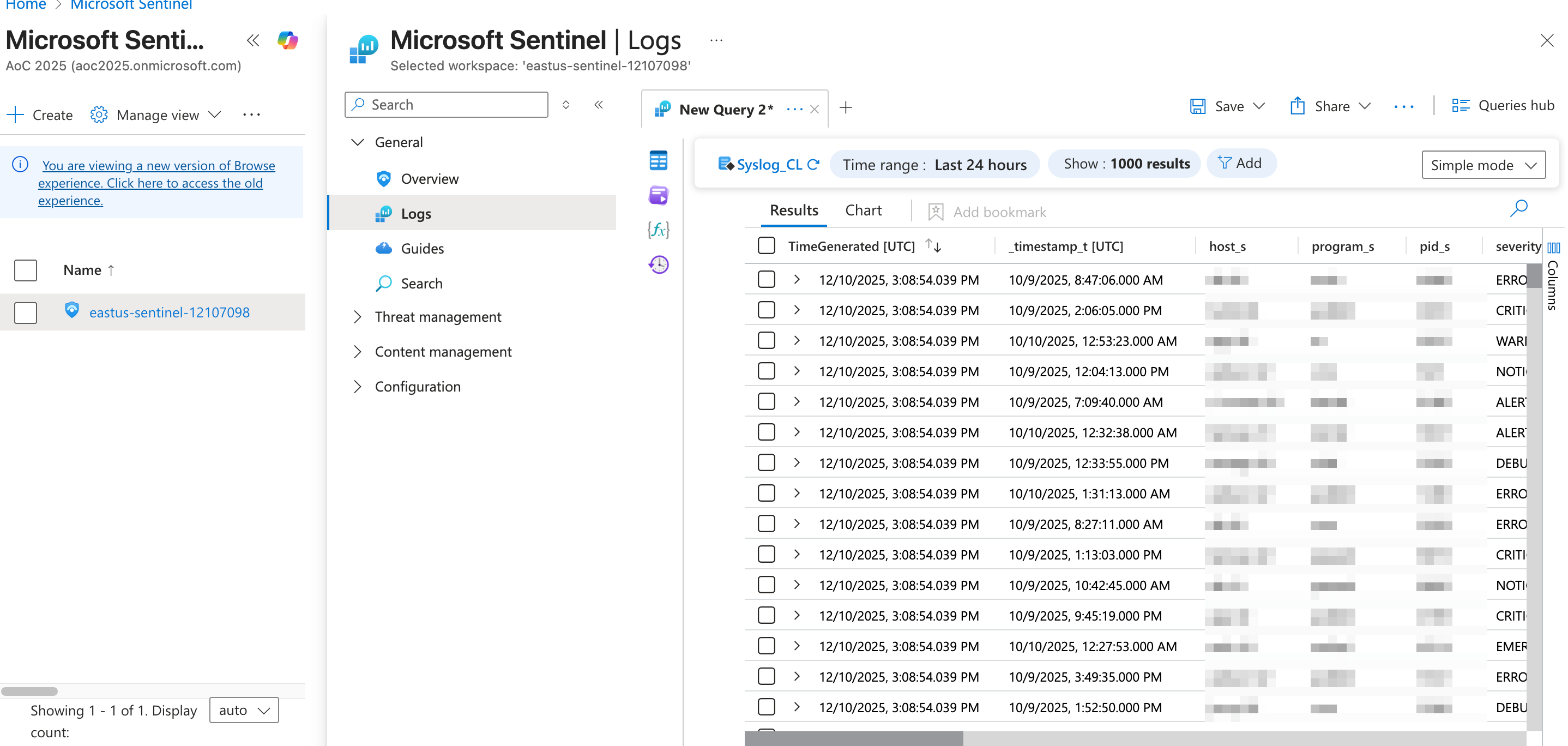 Then, click your dedicated Sentinel instance, go to the Logs tab and select the custom log table named Syslog_CL.