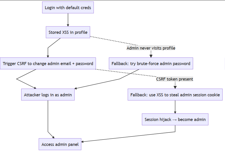 In the previous task, we walked through a chain that went something like this: log in with a default password → exploit XSS → trigger CSRF → change admin email and password → gain admin. It reads nicely, but reality often throws in complications.