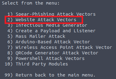 The next menu will show a number of different kinds of attack that you may wish to look at later. For now though select option 2 as we'll be attacking a website.