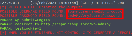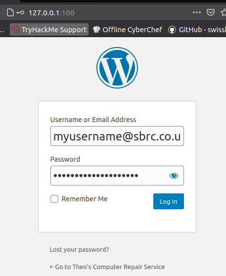 Almost there! Now comes the interesting part - we need to choose a website to clone. Most wordpress sites like repairshop.sbrc have an adminstrator login page. You can find the repairshop one in Firefox by going to http://repairshop.sbrc/wp-login.php