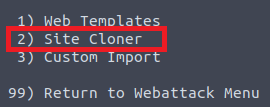 We're now ready to clone a website. Navigate back to the main menu by typing in '99'. The main menu looks like this: