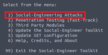 You can select an option by typing in the number next to it and hitting the ENTER key. So for instance if we wanted to conduct a 'Social-Engineering Attack' (where we create a spoof email in order to impersonate someone else) we would type '1' into the Terminal and hit ENTER.