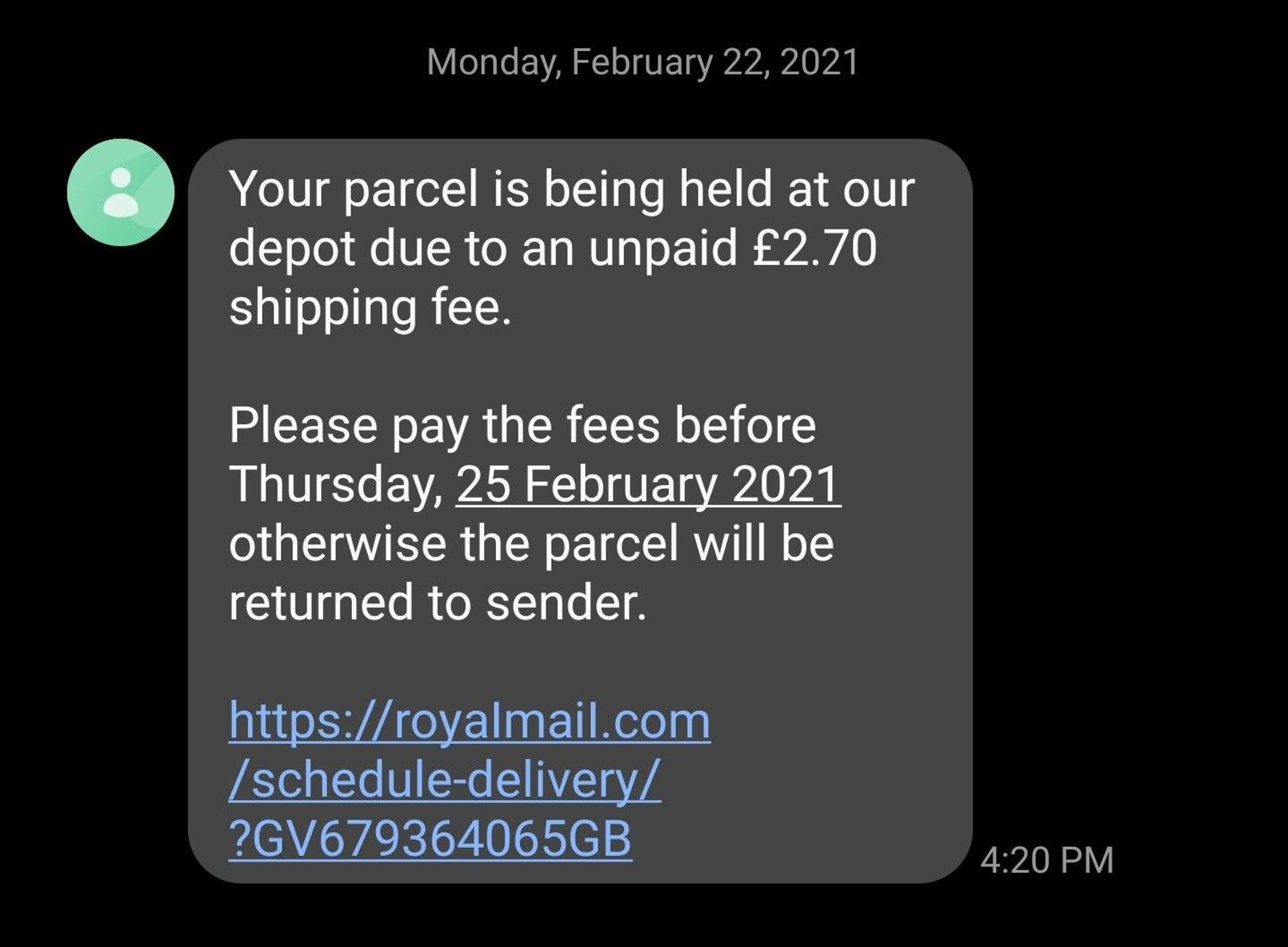 So how can we protect ourselves? Well the obvious clue with our cloned website was the URL - we had to navigate to http://127.0.01. This is the achilles heel of all spoofed sites, although it's not always so obvious. Hackers will use URLs that are visually similar to the real thing in order to fool victims. For instance if they wanted to clone the login page for 'google.com' they might register a site called 'göögle.com' in order to fool a visitor. There's a number of tricks that can be used, like using zeros in place of 'O's (g00le.com vs google.com) and so on. Hacker's don't just use emails either. Here's an example of the same thing using a text message, where the attacker was pretending to be the Royal Mail: