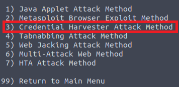 For this particular attack we just want to steal the usernames and passwords (credentials) of unsuspecting victims so select option 3 on this menu.