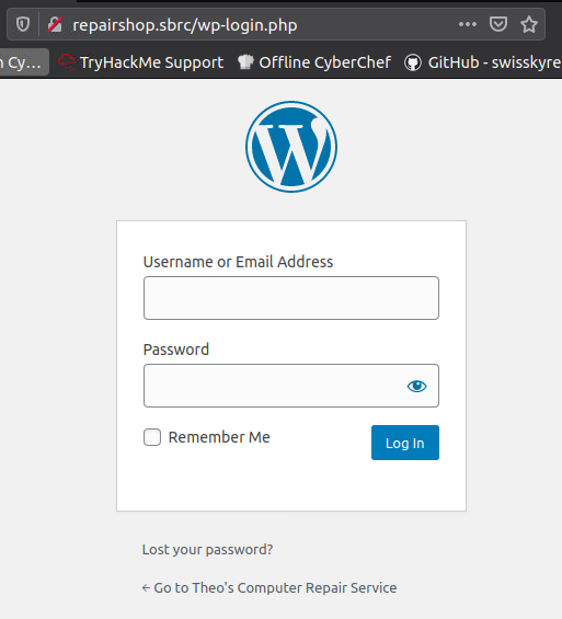 First, let's login. Head to http://repairshop.sbrc/wp-login.php