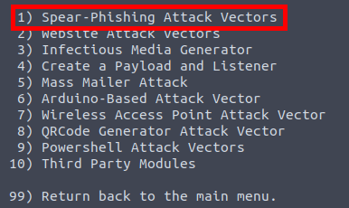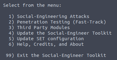 If you like, you can take a moment to navigate through some of the options. You can always return to the main menu by typing '99' and hitting the ENTER key. If you accidentally exit out of the Social Engineering Toolkit application just type setoolkit