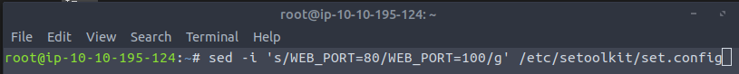 sed -i 's/WEB_PORT=80/WEB_PORT=100/g' /etc/setoolkit/set.config