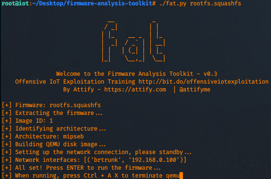 Now, let's kick off fat (firmware analysis toolkit) and emulate the system.