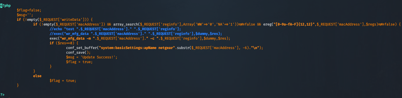 The next step would be analyzing each php file to try to find a vulnerability. I'll save you that time, and we'll take a look at "boardDataWW.php". This file contains a Command Execution vulnerability. The piece of code that we are interested is this: