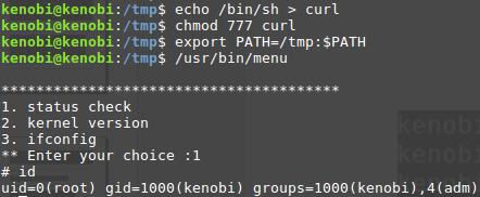 We copied the /bin/sh shell, called it curl, gave it the correct permissions and then put its location in our path. This meant that when the /usr/bin/menu binary was run, its using our path variable to find the "curl" binary.. Which is actually a version of /usr/sh, as well as this file being run as root it runs our shell as root!