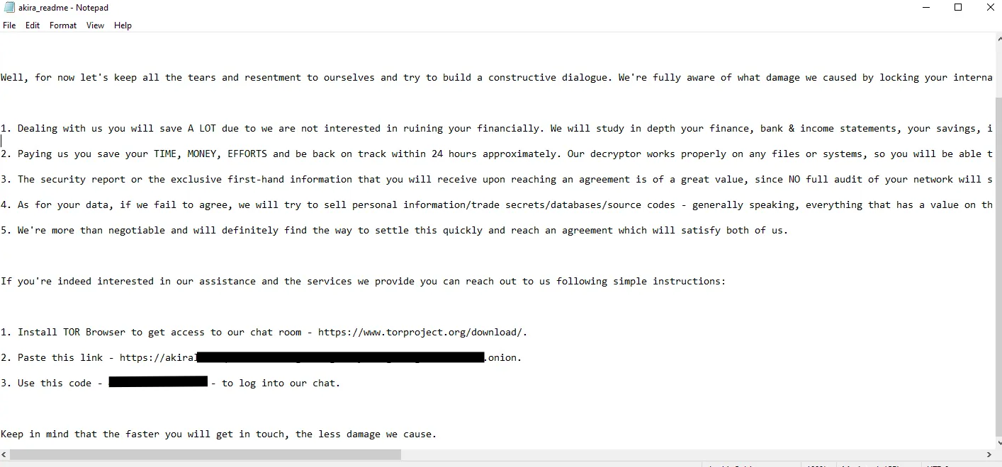 For example, we can observe the ransom note that the Akira ransomware leaves once a host is compromised.