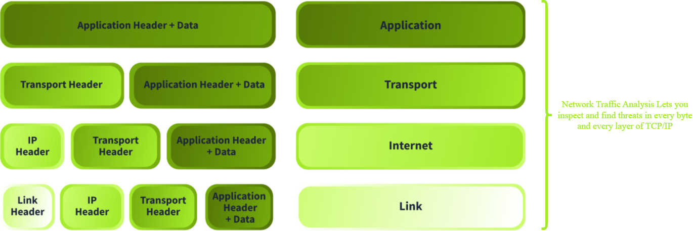 The best way to showcase the traffic we can observe in the network is by using the architecture implemented in nearly every device with a network interface: the TCP/IP stack. The image below shows the different layers of the TCP/IP model. Each layer describes the required information (headers) to pass the data to the next layer. The information included in each header, together with the application data, is precisely what we want to observe. Logs often include bits and pieces of these headers, but never the full packet details. This is why we need to do network traffic analysis.