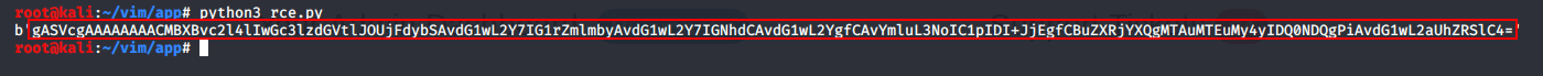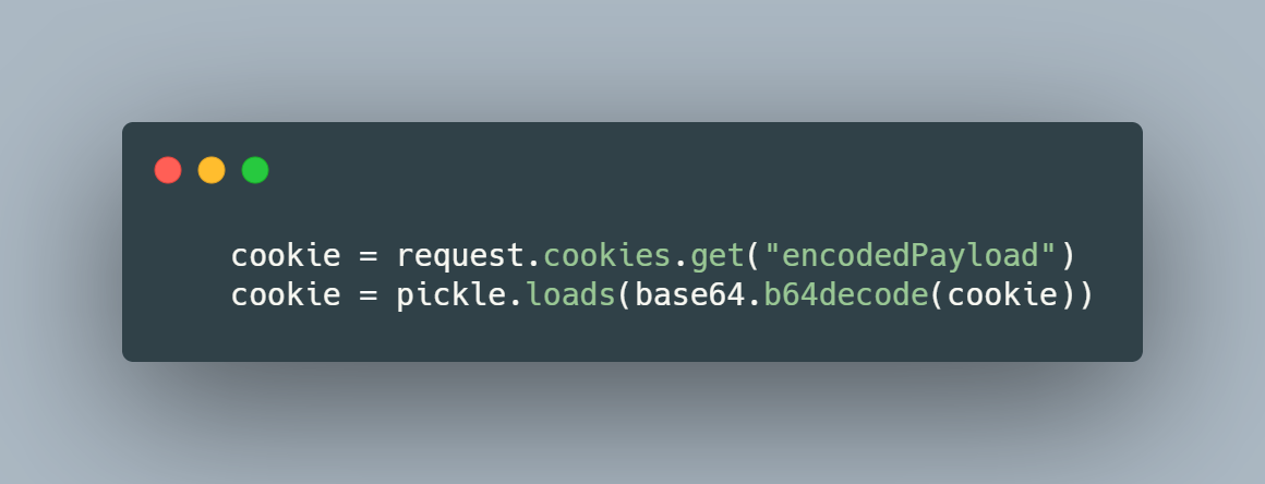 When you visit the "Exchange your vim" URL, A cookie is encoded and stored within your browser - perfect for us to modify! Once you visit the feedback form, the value of this cookie is decoded and then deserialised. Uh oh. In the snippet below, we can see how the cookie is retrieved and then deserialized via pickle.loads