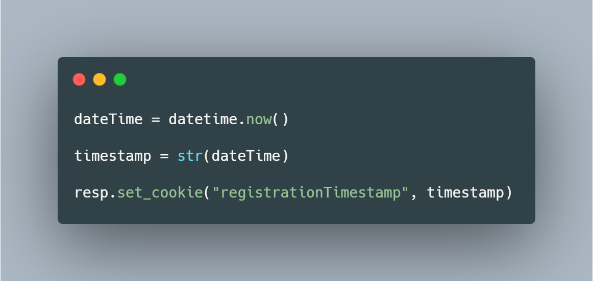 Setting cookies in Flask is rather trivial. Simply, this snippet gets the current date and time, stores it within the variable "timestamp" and then stores the date and time in a cookie named "registrationTimestamp". This is what it will look like in the browser.