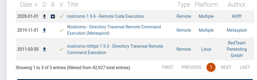 What do you know, this server is using the default page for the nostromo web server. Now that we have a version number and a software name, we can use exploit-db to try and find an exploit for this particular version.