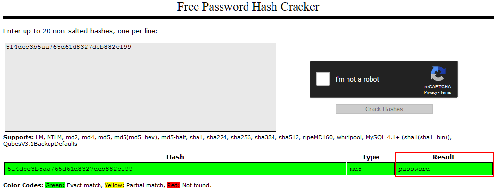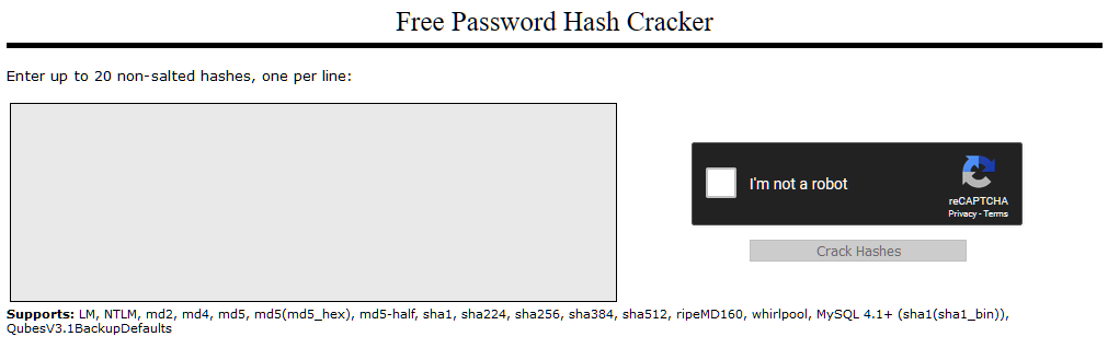 Instead we will be using the online tool: Crackstation. This website is extremely good at cracking weak password hashes. For more complicated hashes we would need more sophisticated tools; however, all of the crackable password hashes used in today's challenge are weak MD5 hashes, which Crackstation should handle very nicely indeed.