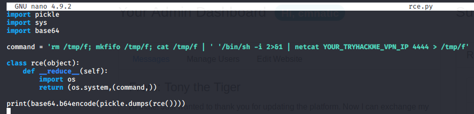 Once this is complete, copy-and-paste the source code from this python file (pickelme.py) to your kali and modify the source code to replace your "YOUR_TRYHACKME_VPN_IP" with your TryHackMe VPN IP. This can be obtained via the Access page.