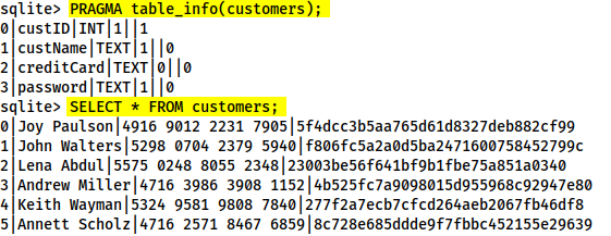 We have the custID (0), the custName (Joy Paulson), the creditCard (4916 9012 2231 7905) and a password hash (5f4dcc3b5aa765d61d8327deb882cf99).