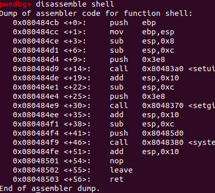 Previously we figured out that we need to provide 44 characters of input, and then we can execute whatever part of the program we want. Now the next step is to find out exactly where the shell function is in memory so we know what to set EIP to. GDB supports this as well with the disassemble command. Type disassemble shell, and this should pop up.