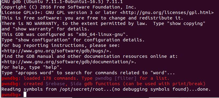 The SUID file seems to expect 32 characters of input, and then immediately exits. This seems to warrant further investigation. Luckily I was practicing binary exploitation back when I was using that PC, so I have tools preinstalled to examine. One of those tools is pwndbg, a plugin for GDB which allows you to better examine binary files.