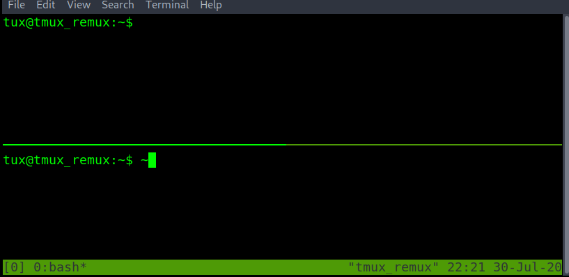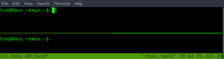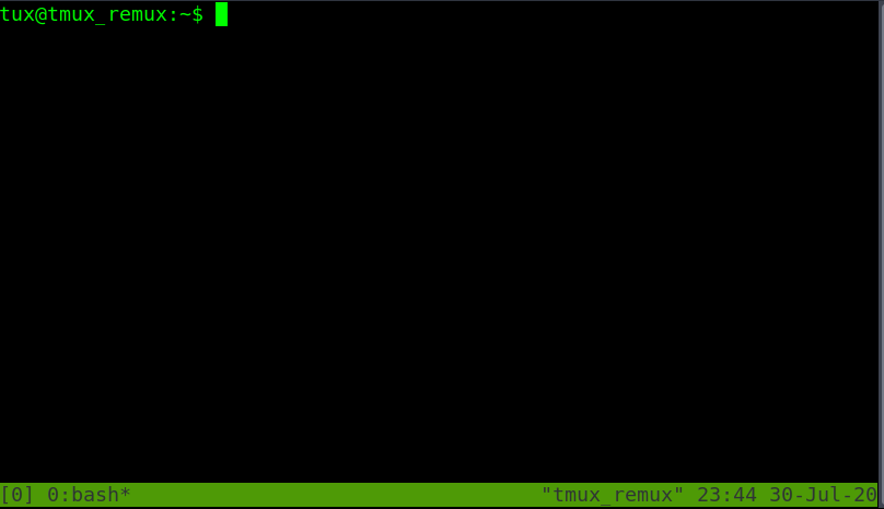 To start a new tmux session just run the tmux command with no arguments. The first session create will have the name "0". By default, tmux status bar will be green. With session name on the left. Windows in the middle and window names in the middle. Hostname, time, and date on the right of the bottom green bar.