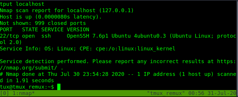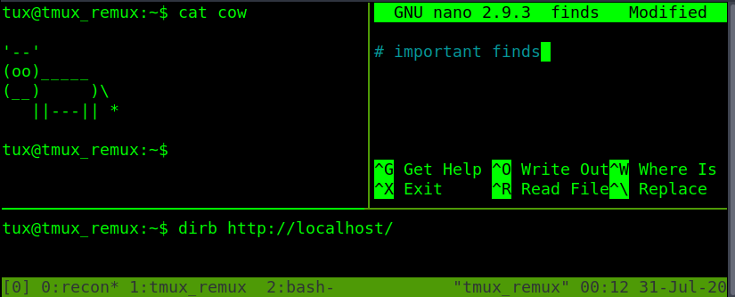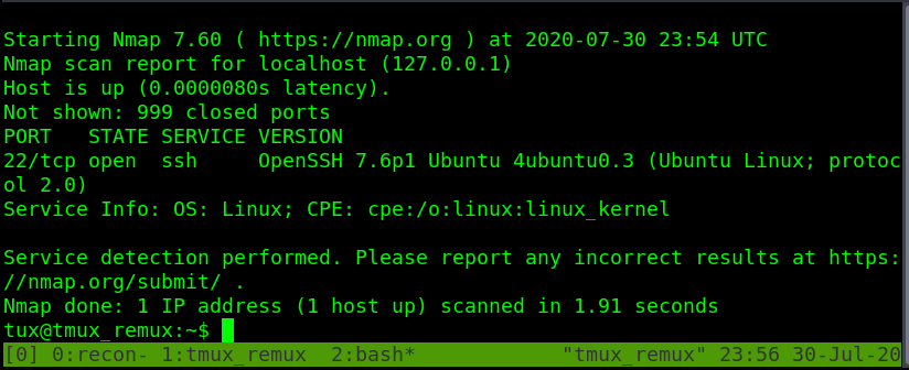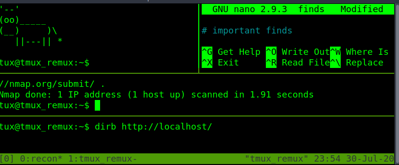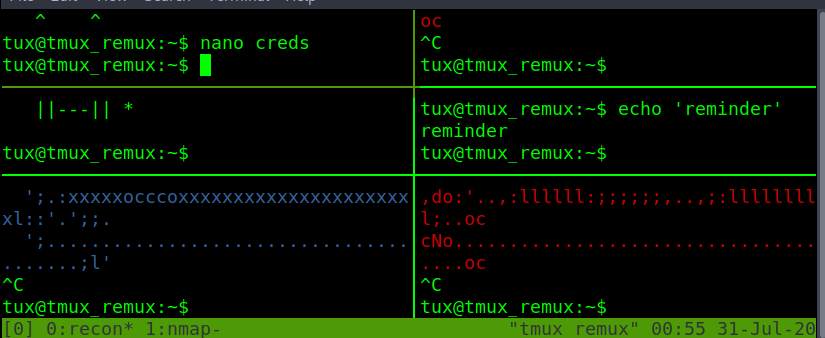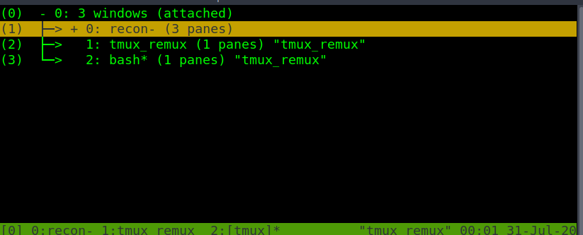 Oh NO. The recon window has been cluttered with multiple panes and can't view the Nmap output. To detach a pane into its own window. move the desired pane to move to its own window. Then prefix shift !.