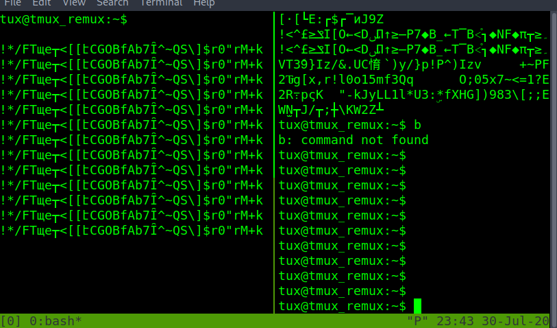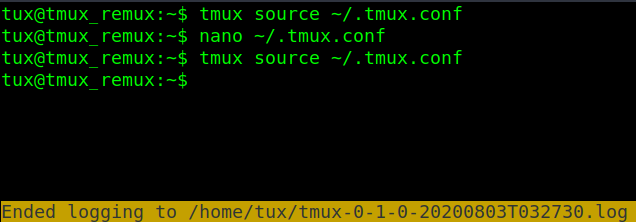 Another .tmux.conf reload. To start command history logging for the currently selected pane do prefix shift p. This will start a log file within the current user's home directory.