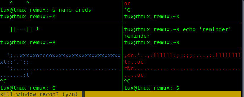 # IMPORTANT WARNING. Before running the kill-server command backup and save everything. On every session, window, and pane because this command will stop everything.