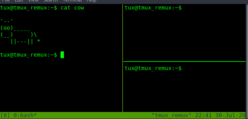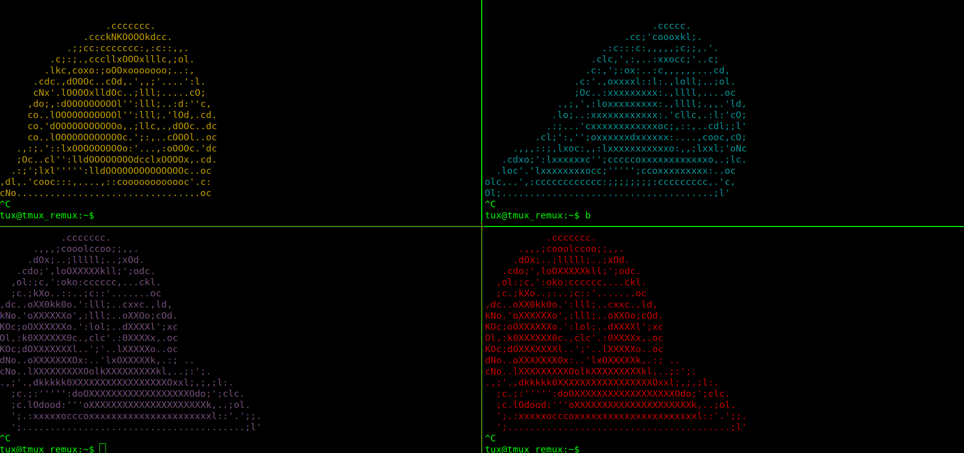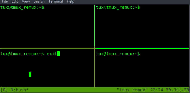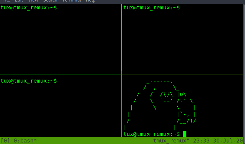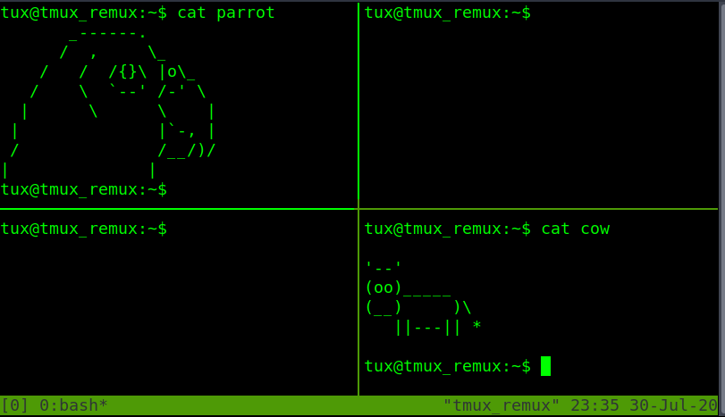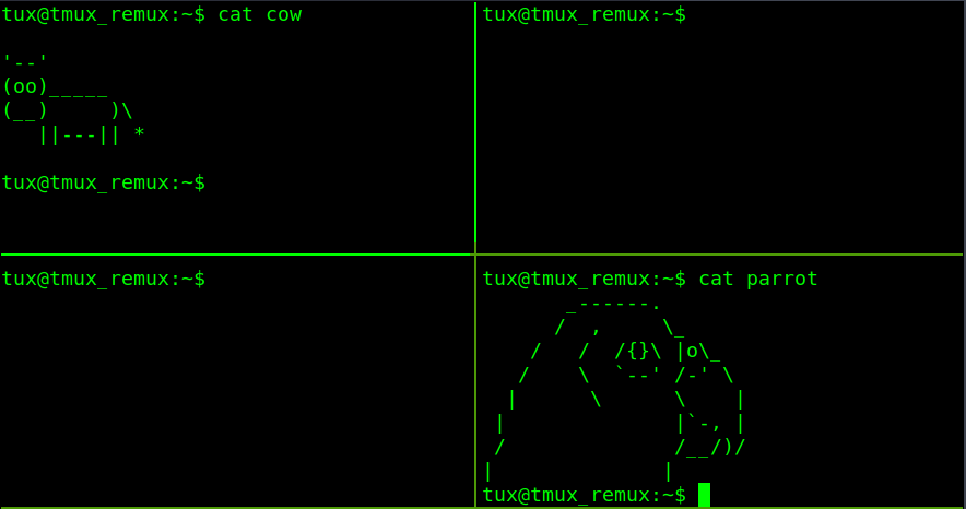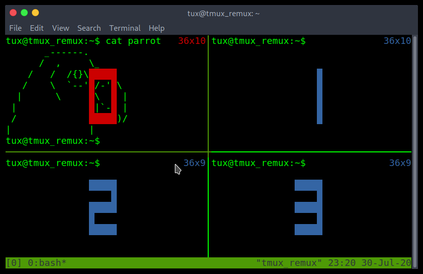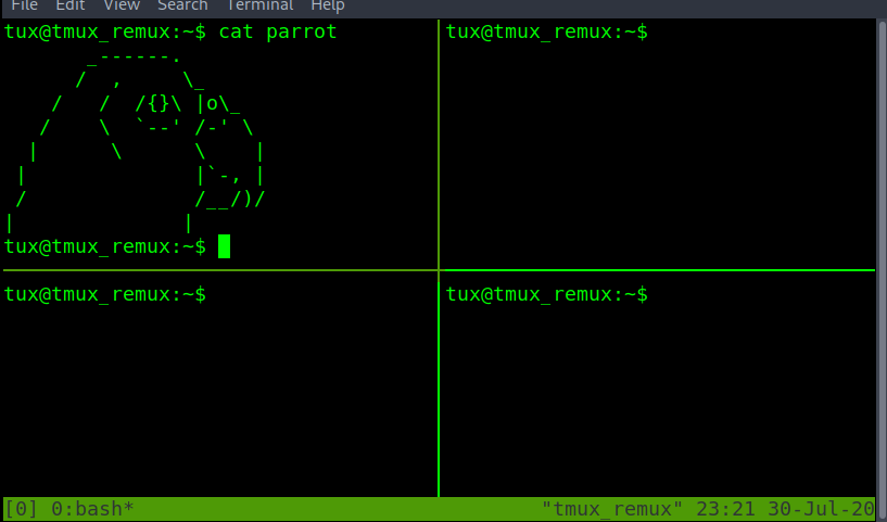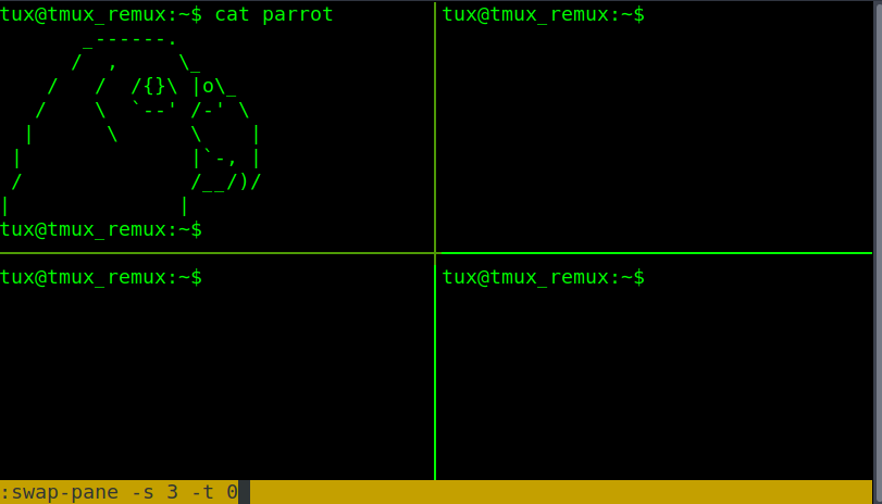 With the command above in this example. The currently selected pane of the parrot has moved to the bottom right and has followed the currently selected pane. Still able to start typing within the parrot pane without having to switch to another pane.
