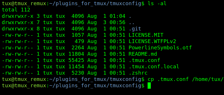 Second. Install the tmuxconfig repository with git clone and copy the hidden .tmux.conf file to the home directory of /home/username/