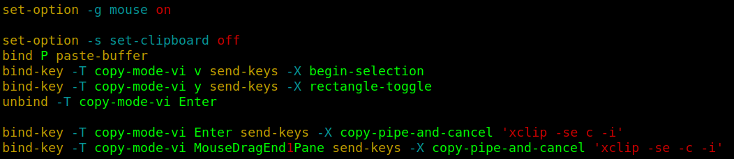 The last two lines below allow anything though vi y key to be also saved secondary Linux keyboard. The secondary keyboard is the ctrl c ctrl v. This means that the copy text will be pasted from the ctrl v buffer. Instead of the copied text being trapped within tmux.