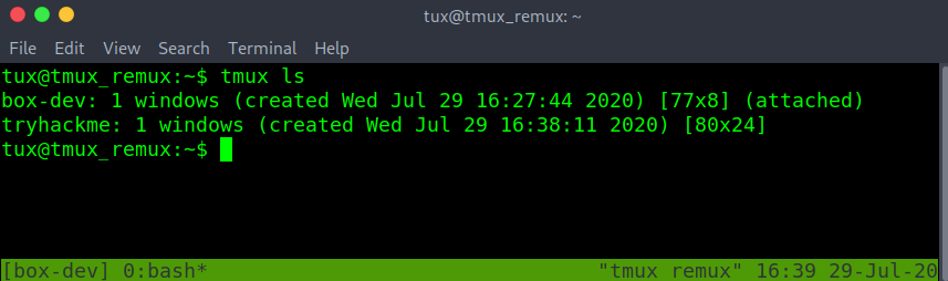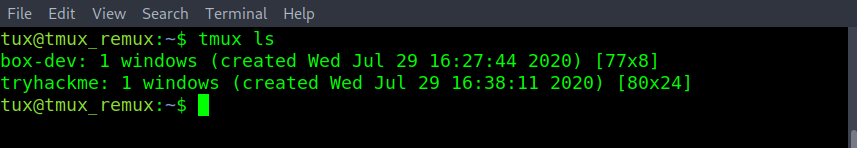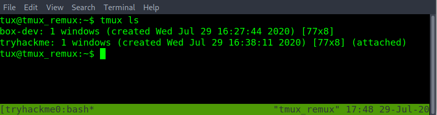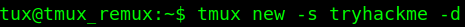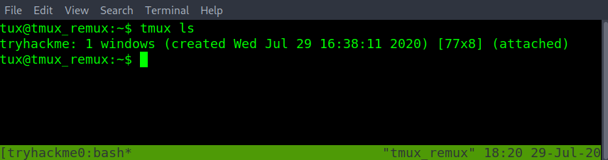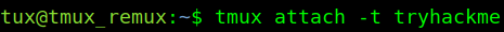 The tmux session name has changed to the attached session of "tryhackme". Double-checking with tmux ls. Can confirm that "(attached)" also on the "tryhackme" session name.