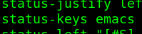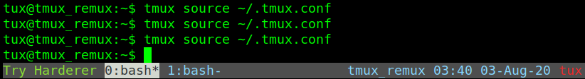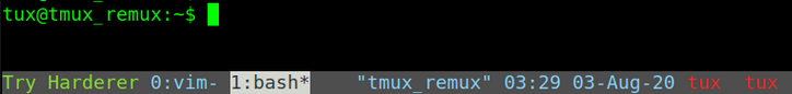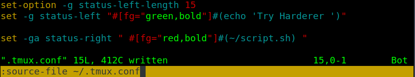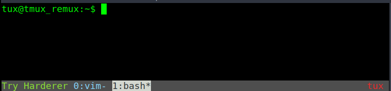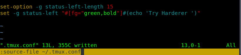 The left side of the status bar can be customized with status-left within set or set-option. In the example below the first one status-left-length 15. Set the total amount of characters that can be shown on the left. The following line displays 'Try Harderer' with the echo Linux command.