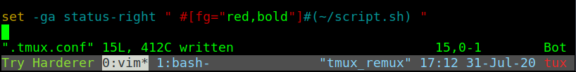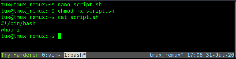 Reloading the .tmux.conf file again shows the output of whowami from the script.sh