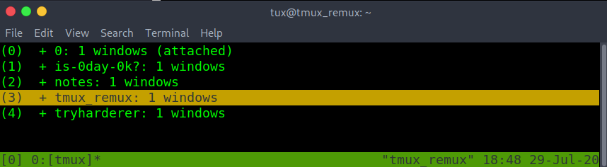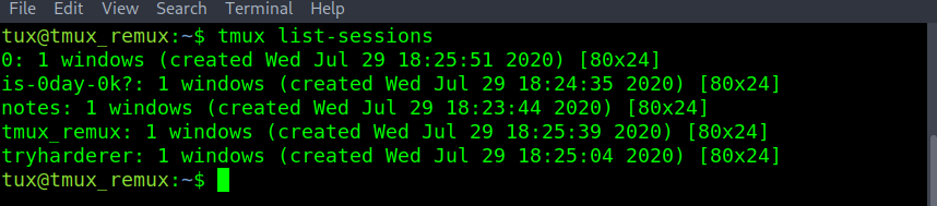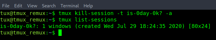 From the five active sessions above. If there was a need to kill all the sessions except for a single one. When using the tmux kill-session. Use the -a argument to close all sessions except the one specified by the -t argument. Closing all tmux sessions except for the one named "is-0day-0k?". Checked with the tmux list-sessions.