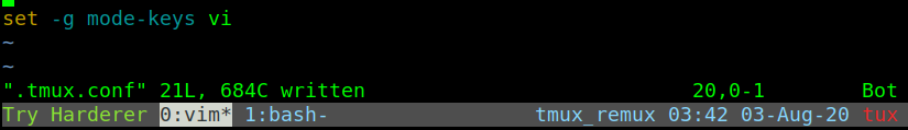 To changes, this adds the set -g mode-keys vi. Save the .tmux.conf script and reload. To copy with this setting.