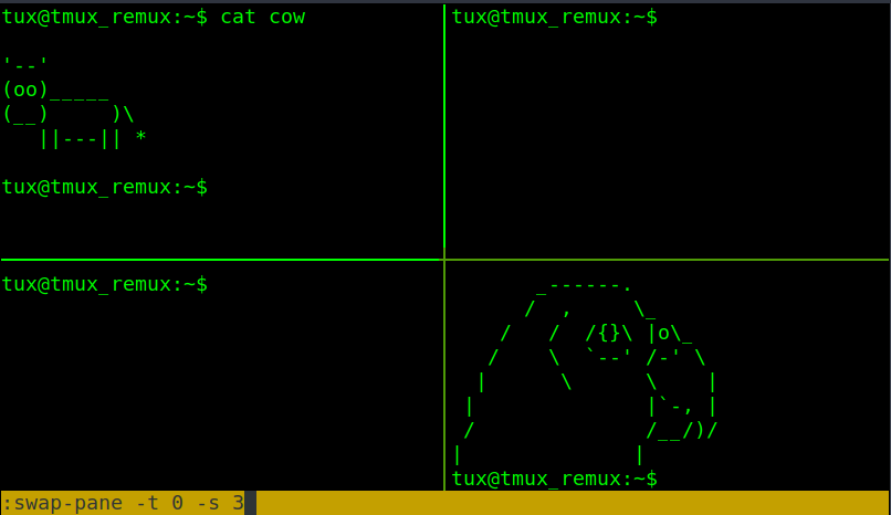 Started with the parrot in the bottom right pane. After the command. Have swapped places with the cow. Also, the new currently selected pane is the cow.