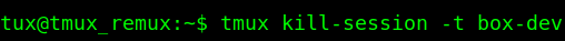 Listing sessions with tmux ls. This shows that the session name of box-dev has been removed. WARNING! By deleting the session. Anything open in that session will be lost if not saved before the tmux kill-session.