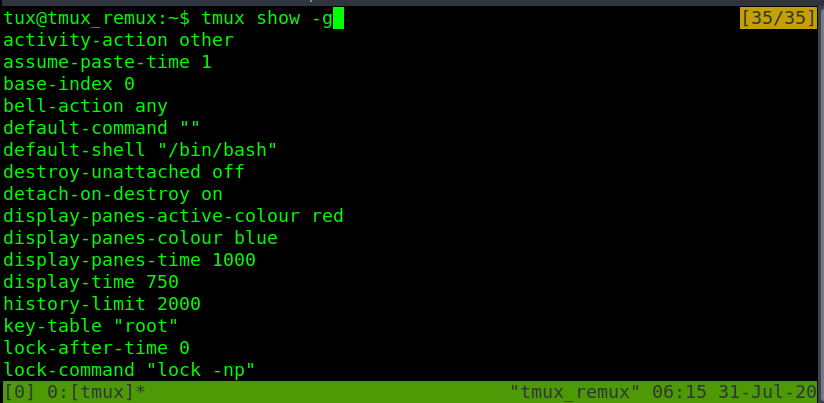 Before crafting a custom configuration file for tmux. It might be a good idea to show all the options of the defaults. With tmux show -g argument for global.