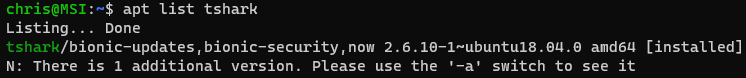 In my output above, we can see that it is installed. If it's not installed, sudo apt install tshark will do the trick.