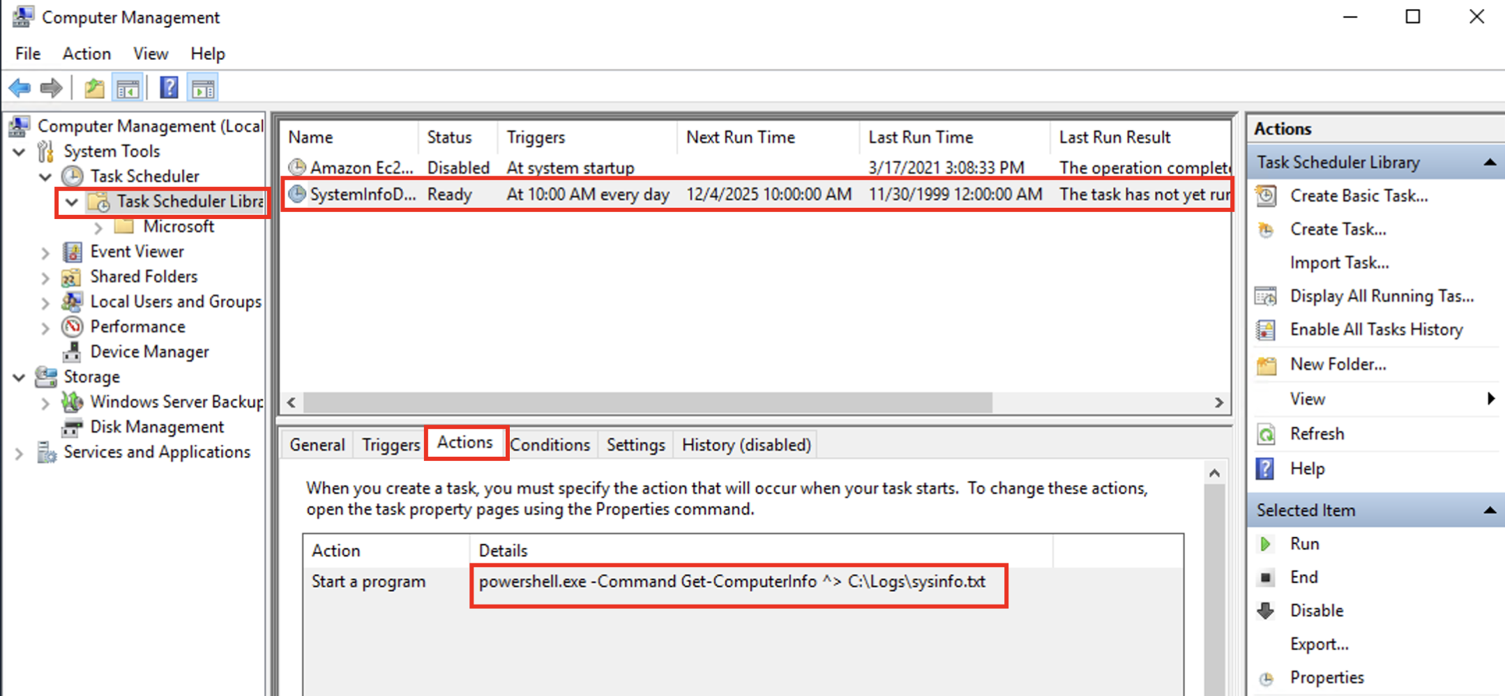 To view the scheduled tasks that are present on the system, click Task Scheduler Library. This will display all the scheduled tasks of the system. You can click on any of them to view their details. The screenshot below shows a scheduled task named SystemInfoDailyLog configured to run every day at 10:00 AM. Here, you will see the program or command that will run when the task is triggered.