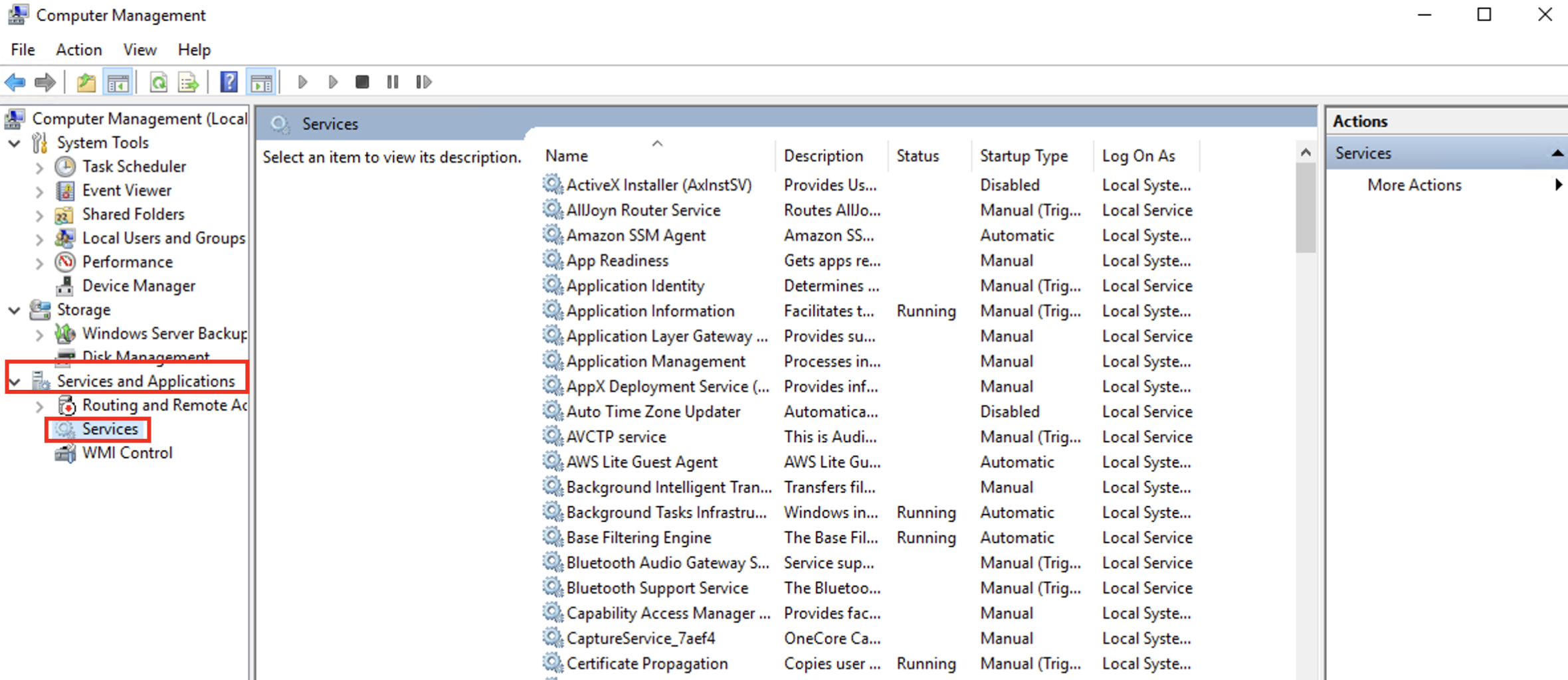 Recall from the previous task, a service is a special type of application that runs in the background. You can see all the services and their statuses by clicking the Services button given under the Services and Applications section, as shown below: