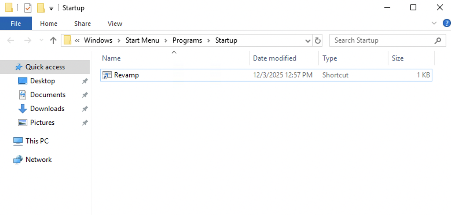 If you open the Task Manager for the attached VM, you will notice that it doesn't display a Startup tab. You will also not see anything in the Startup tab inside the msconfig utility, as shown above. This is because the attached machine is a Windows server, and Windows servers handle startup applications differently than Windows client systems. Unlike Windows 10 or 11, you will not see startup programs in Task Manager or in the Startup tab of msconfig. On these Windows server machines, the only reliable way to view user-level startup items is through the Startup folder itself. You can access it by pressing Win + R, which opens the Run Dialog, typing shell:startup, and then pressing Enter. This will display all startup programs as shortcuts or executables that are configured to run automatically the next time a user logs in. This is where you can verify applications that are configured to launch at startup. Below is a screenshot of the startup folder from another Windows server (not from the attached VM):