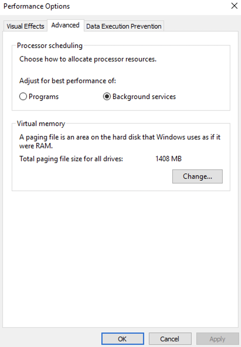 In this Performance tab, the Advanced option can also tell you about the page file size configured for the drives. In this case, it's 1048 MB. The other settings here can give you the following information: