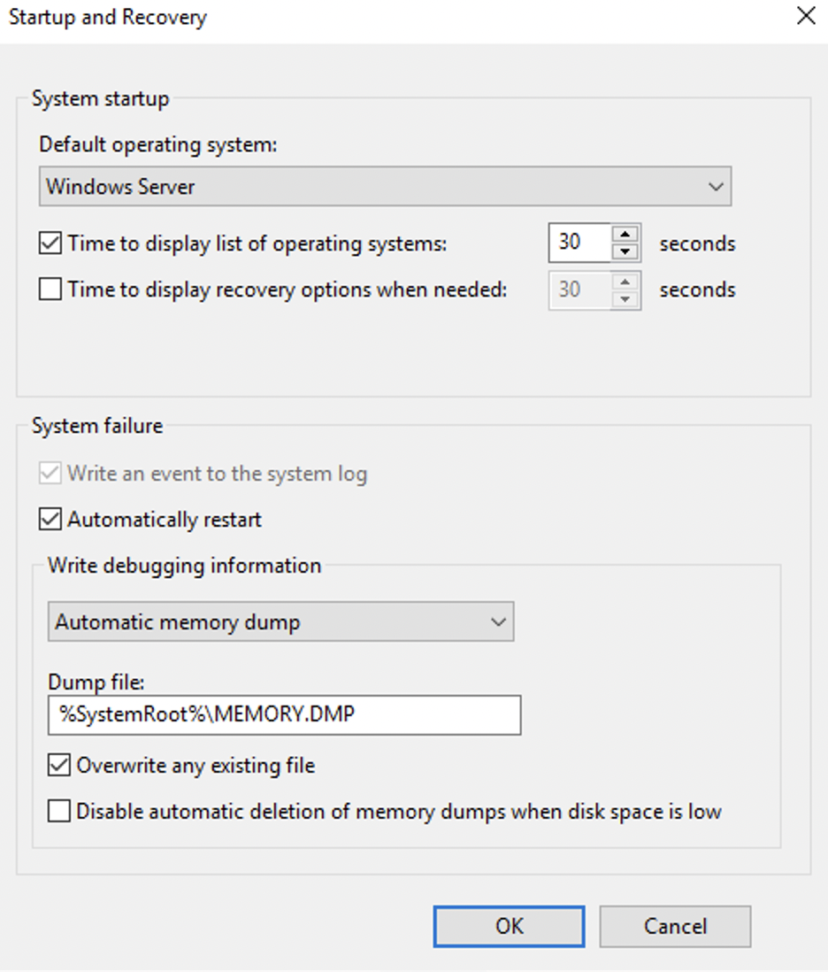 Here, you will find different settings for the startup and recovery. The Write debugging information dropdown tells you the type of crash dump configured for the system. Windows supports different dump types, such as: