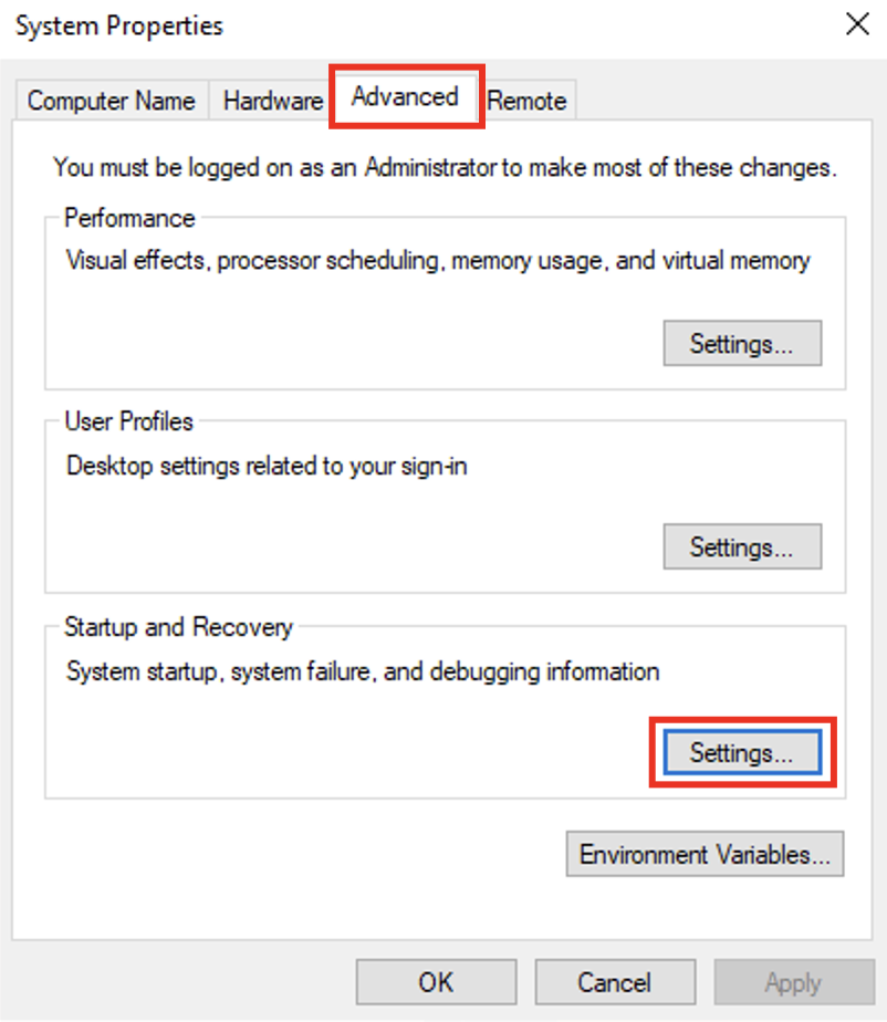 There is another cool configuration that you can find in the Advanced System Settings. It is known as Startup and Recovery. Windows can create a crash dump file whenever it encounters a critical error, such as a Blue Screen of Death. This crash dump helps the administrators or analysts understand what went wrong during the crash. You can view or modify the crash dump settings by navigating to the Advanced option at the top and then clicking Settings under the Startup and Recovery section.