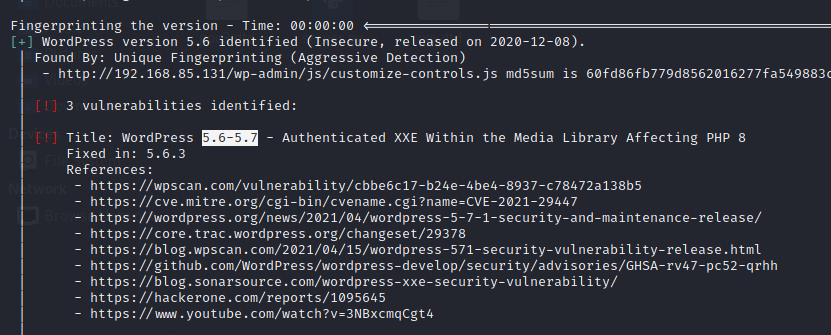 A WordPress site affected by this vulnerability has been identified via the WPScan tool. We can see the output of this tool below from our enumeration.