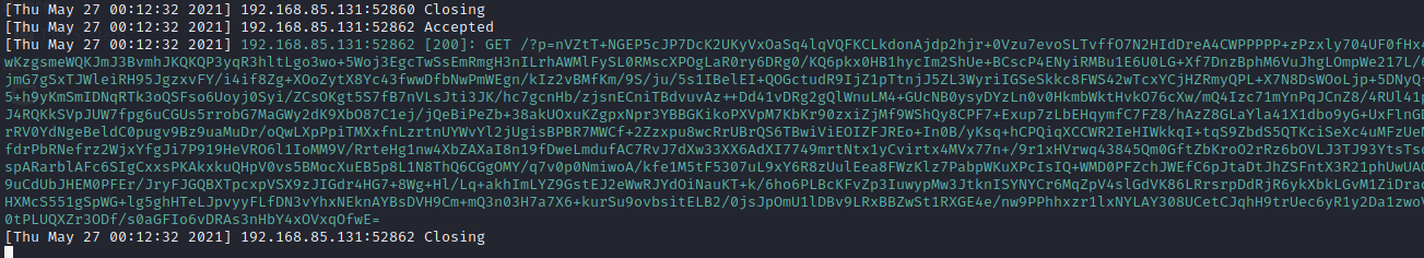 Once you've uploaded the .wav file, you should see the following request in your HTTP server logs. Note, in order to exfiltrate data effectively we've used Zlib for encoding.